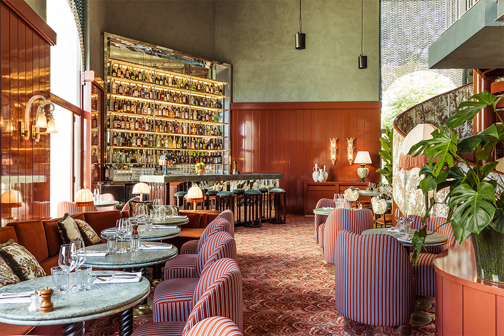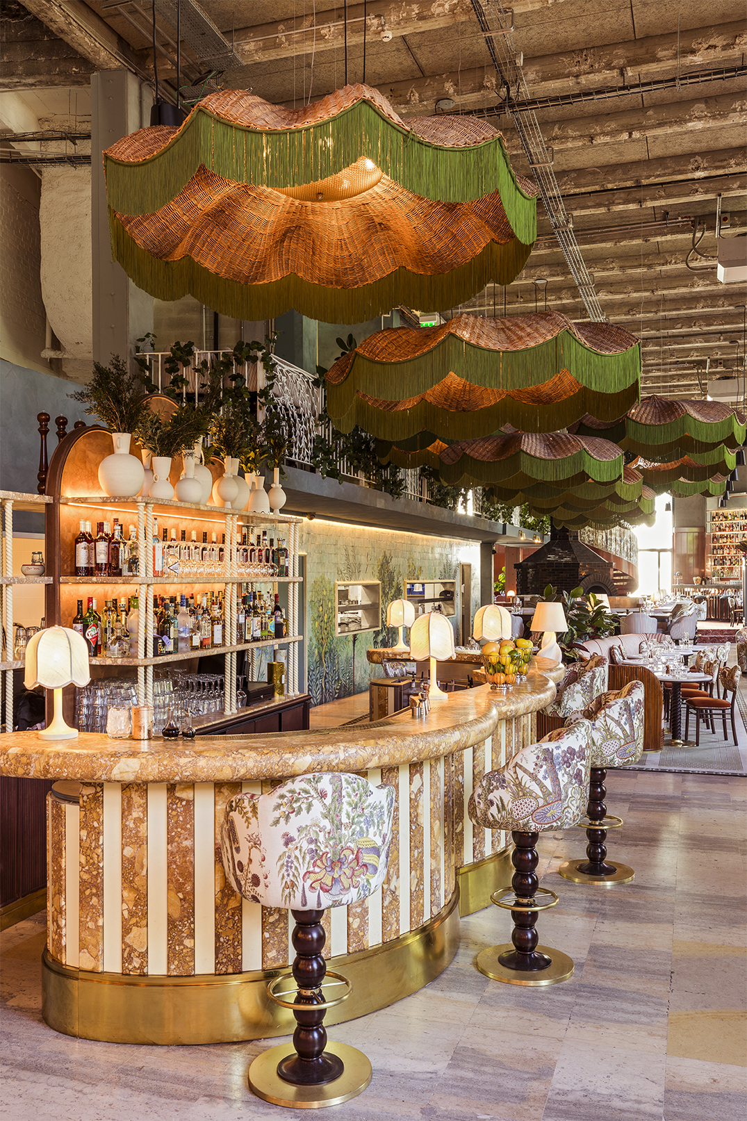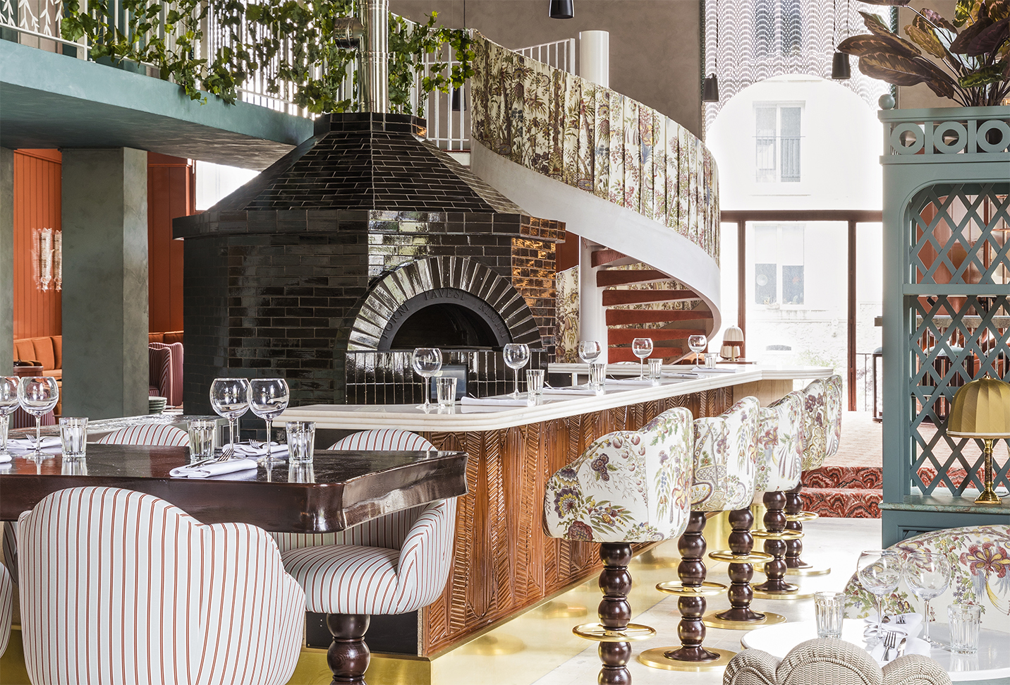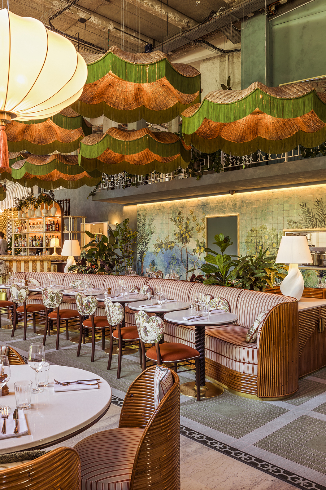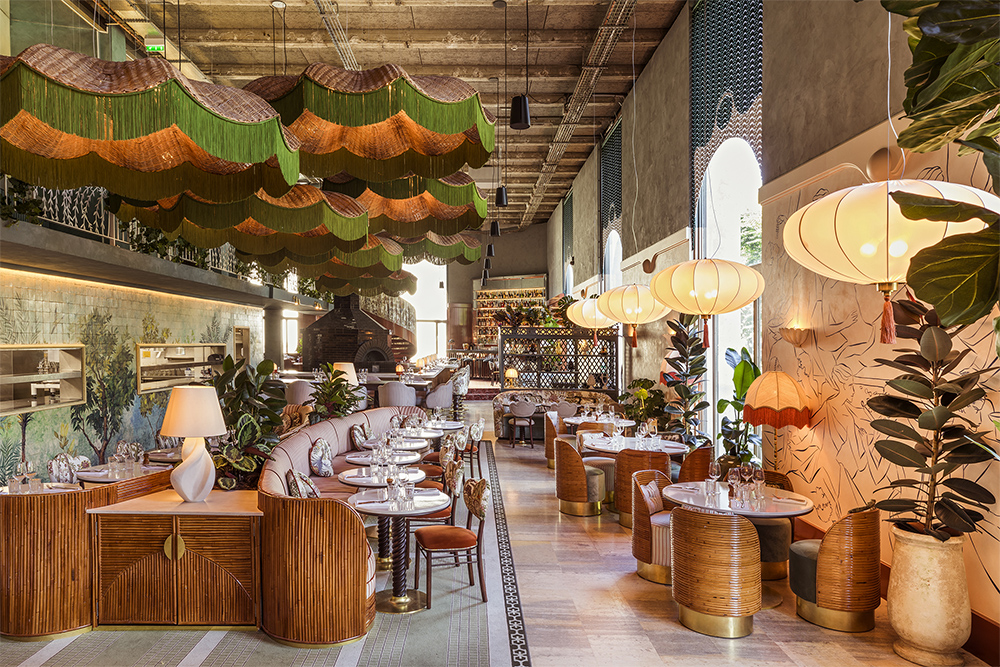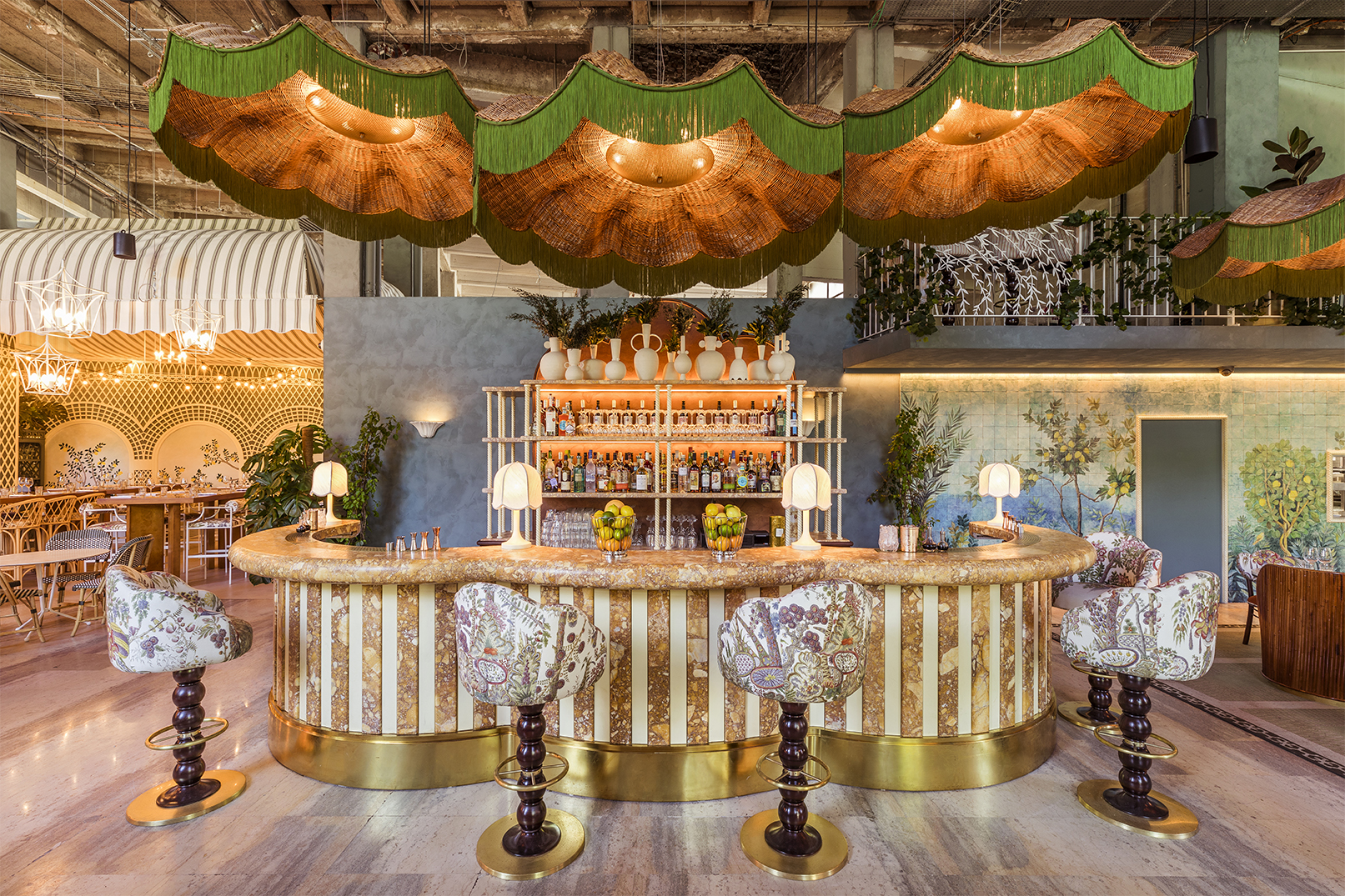Cohabitent ainsi, verre de Murano, rotin, marbre de Sienne, plâtre, céramiques et tissus flamboyants, créant une bulle onirique, une parenthèse colorée et végétale.